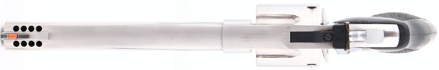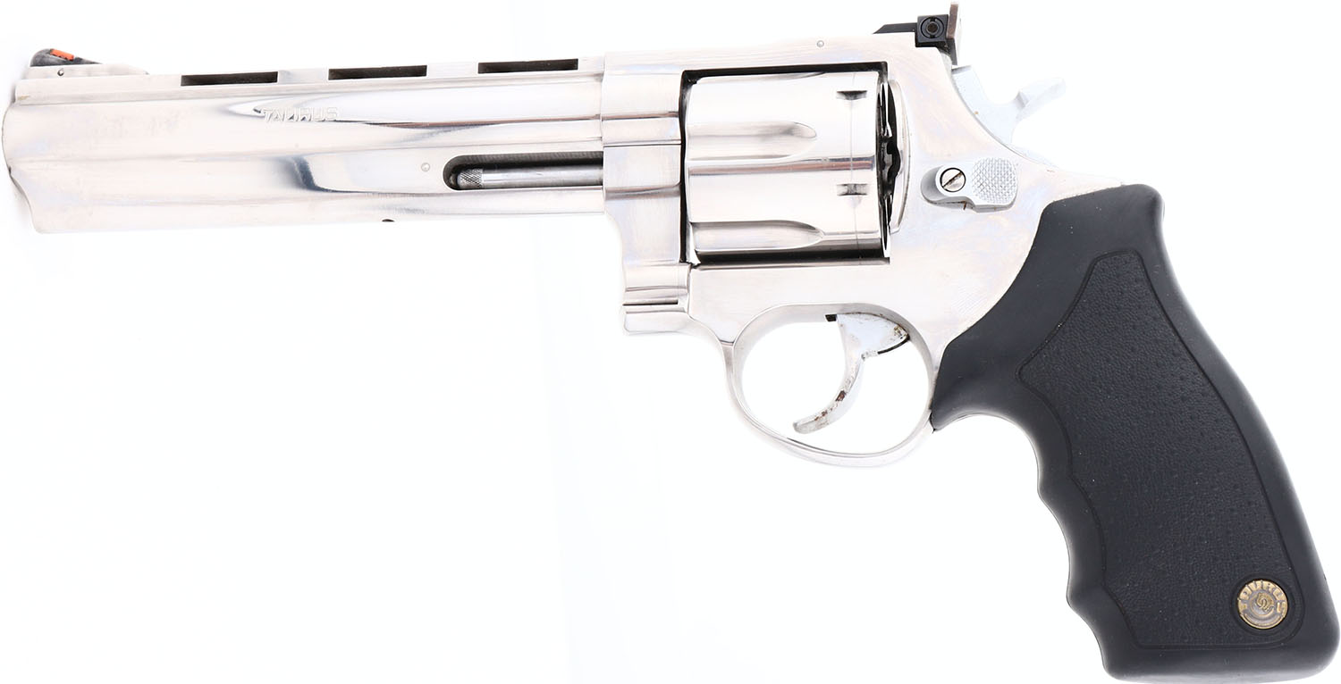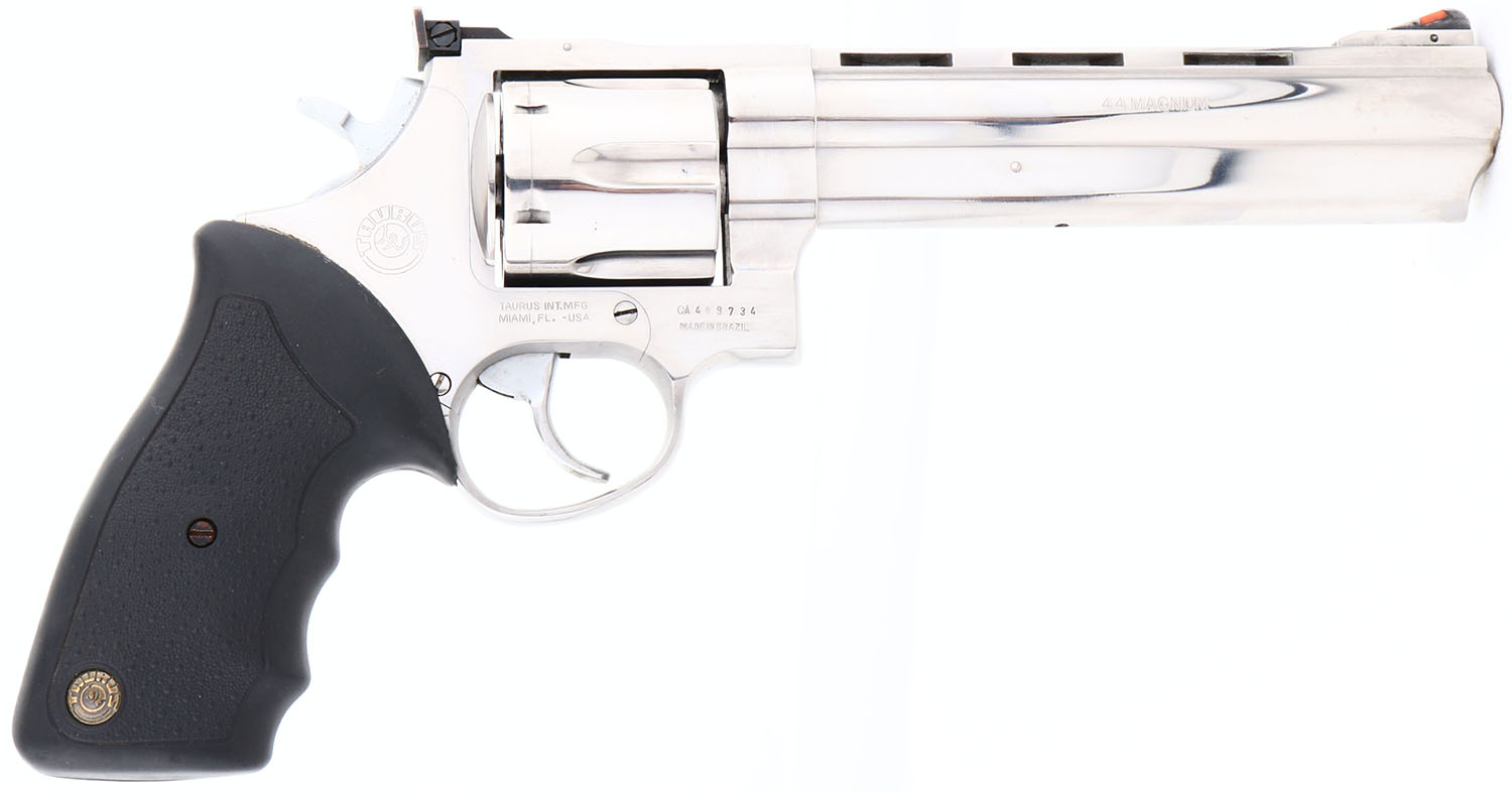 Taurus, .44 Magnum, CAL: 44MAG, MFG: Modern, SN: QA489734, Double Action Revolver, 6 1/2'' ported barrel, with ventilated rib. The original, Taurus logo medallion textured rubber grips are excellent. The polished nickel finish is excellent, with numerous visible brush lines, consistent with nickel finishes. Bore is excellent. The frame holds an adjustable rear sight & elevated blade front sight, with orange insert. FFL Req. - Value: 400 to 800