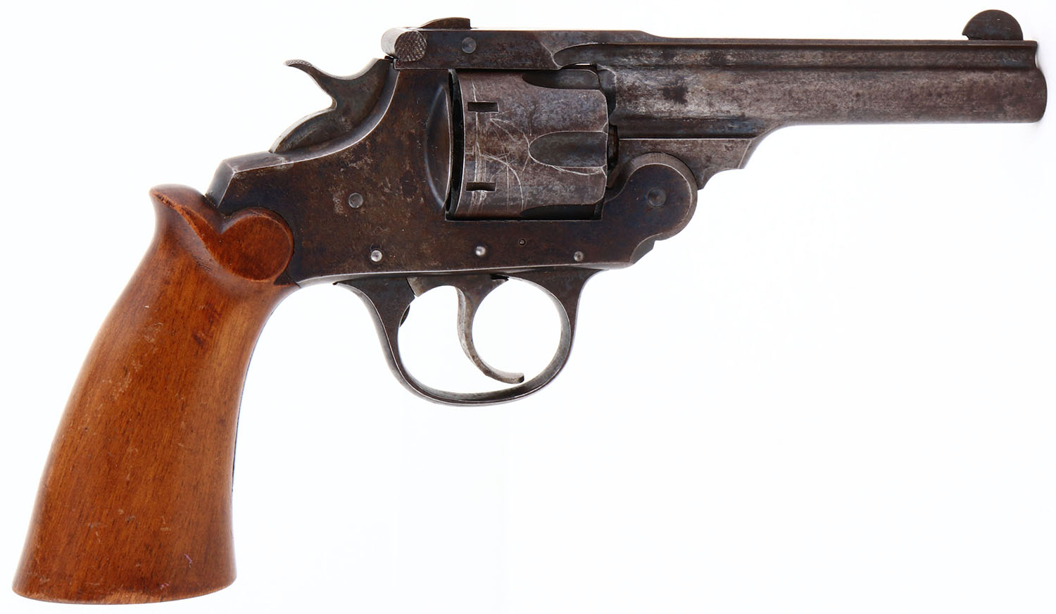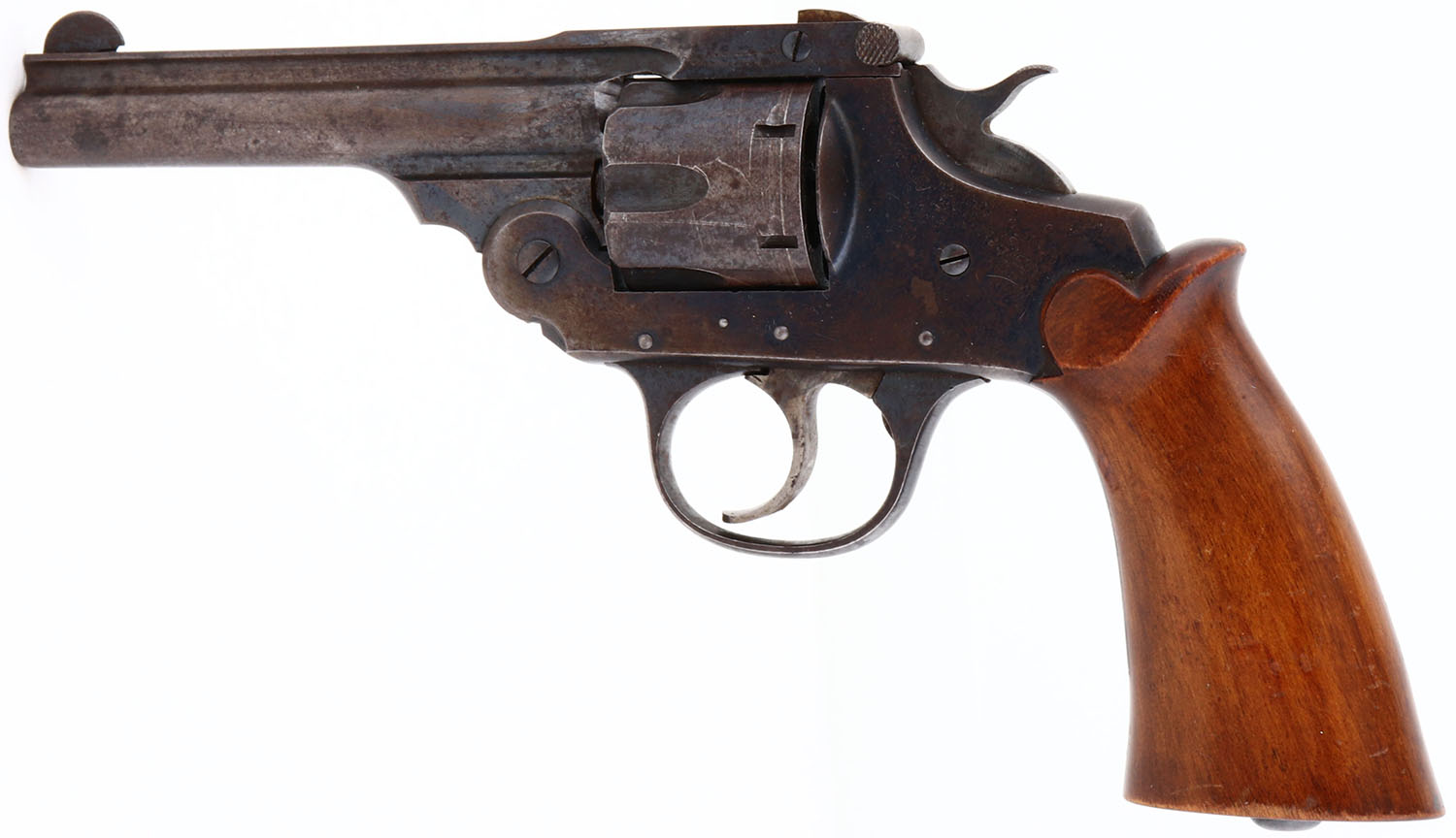 Iver Johnson's Arms & Cycle Works, Top Break Revolver, CAL: 32, MFG: 1894-1941, SN: 62680, Double Action Revolver, 4'' barrel. The one-piece wood grips are excellent. There are minor contusions & scrapes to the finish. The metal blue finish has toned to a mix of remaining original blue & brown patina. Bore is excellent, with intermittent roughness & pitting. The frame holds a fixed notch rear sight & blade front sight. FFL or C&R Req. - Value: 150 to 350