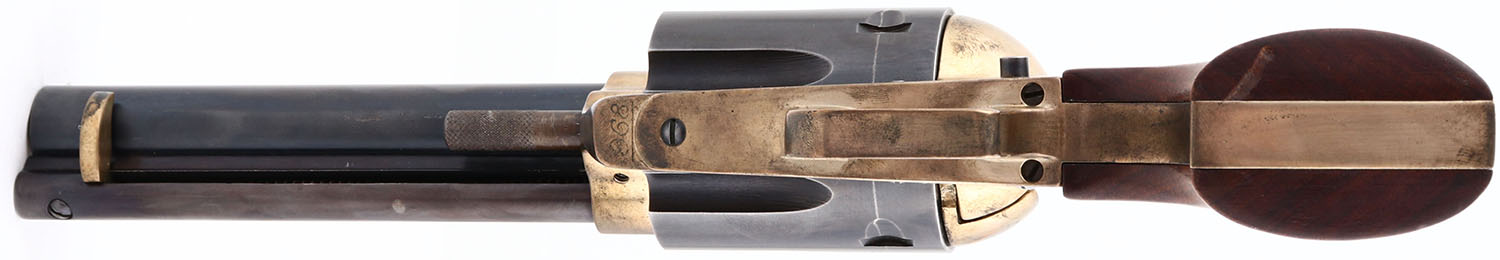Century Mfg Inc, Model 100, CAL: 45-70, MFG: 1970's-80's, SN: 968, Single Action Revolver, 6 1/2'' barrel. The wood grips are excellent. There are minor scrapes to the finish. The metal blue finish on the barrel & cylinder rates 95%, with scuffs & a drag line on the cylinder. The ejector rod housing has toned to a plum patina. The brass frame is excellent, with a thin haze. Bore is excellent & minty. The frame holds an adjustable rear sight & a ramp elevated blade front sight. FFL Req. - Value: 1000 to 2500