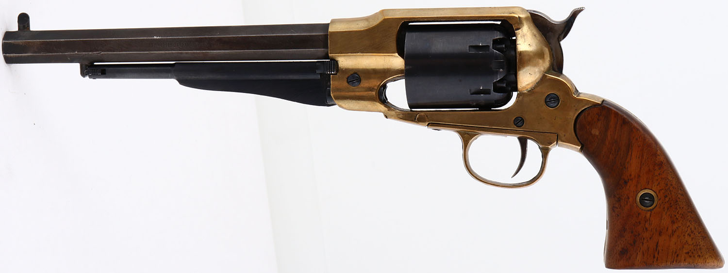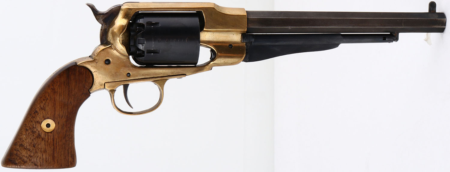 Richland Arms Co., Texas New Army, CAL: 44, MFG: 1970's -90's, SN: 016111, Single Action Muzzleloader Pistol, 7 7/8'' barrel. The wood grips are excellent. There are minor contusions & scrapes. The metal blue finish on the barrel has toned to a brown patina, with blue remaining in protected areas & the metal blue finish on the ram rod & cylinder rates 90%, with spotting toned to a brown patina. The brass frame is very good, with scrapes & visible buff marks. The hammer & trigger are case-hardened, with faint, but visible case-colors remaining. Bore is very good & bright, with intermittent pitting. The receiver has an integrated rear grooved & tall blade front sight. Black Powder, No FFL Req. - Value: 100 to 300