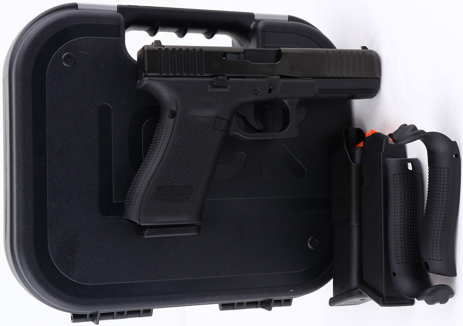 NEW CASED, Glock, Model G22 GEN 5, CAL: 40 S&W, MFG: Modern, SN: BYWD863, Semi-Auto Pistol, 4.5'' barrel. The polymer frame & grips are mint. The factory black colored slide is mint. Bore is mint. Original sights. Comes in the original factory case with 3 15rds mags, speed loader, two extra grip attachments, paperwork, brush & cleaning rod, NOS. FFL Req. - Value: 500 to 650