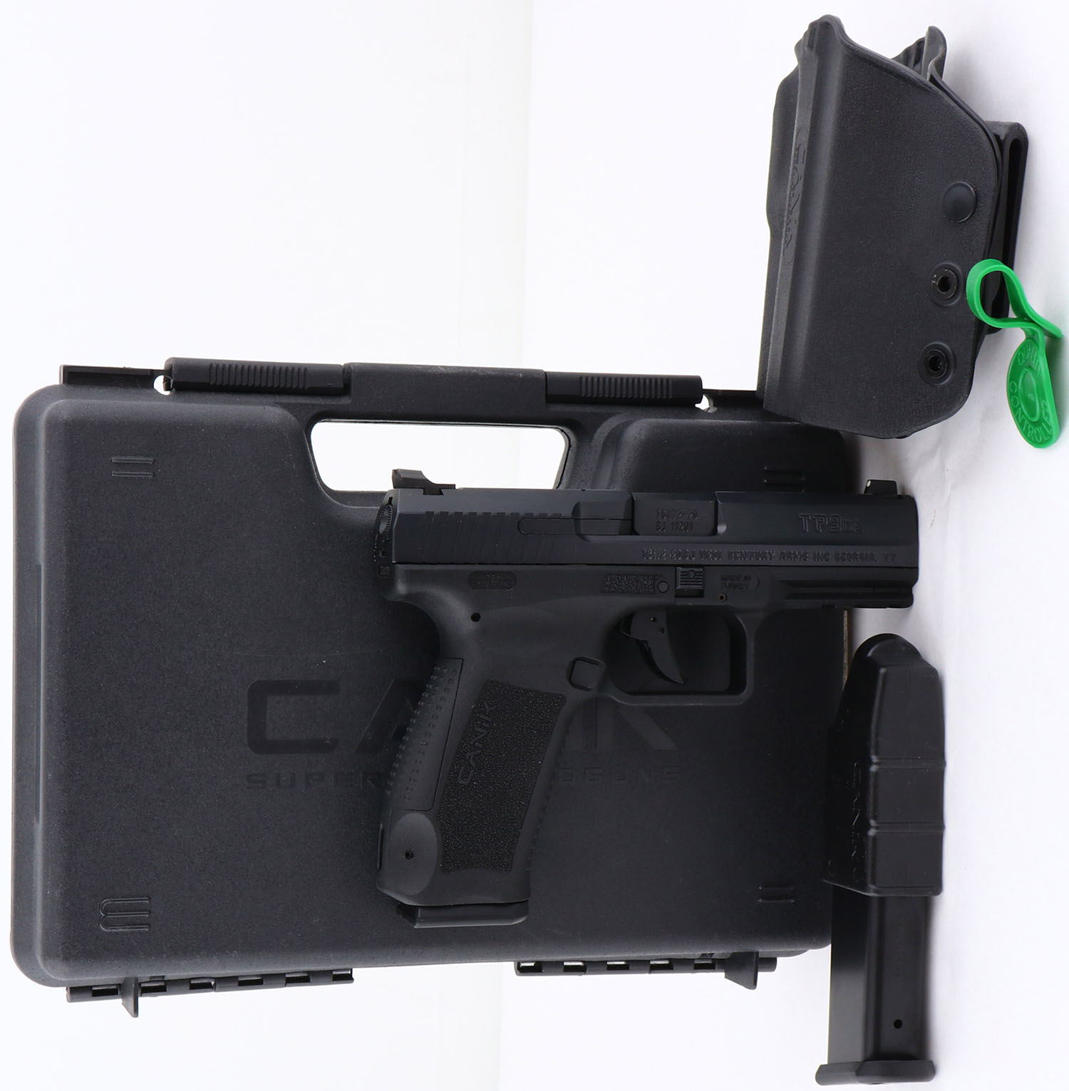NEW CASED, Canik, Model TP9DA, CAL: 9mm, MFG: Modern, SN: 20BJ11201, Semi-Auto Pistol, 4'' barrel. The polymer frame & grips are mint. The factory black Nitride finish on slide is mint. Bore is mint. Factory square notch & white dot sights. Double Action & Single Action trigger group. Interchangeable magazine release. Comes in the original factory case with Canik Formed hip holster, 2 18rds mags, speed loader, extra grip attachment, paperwork, brush, cleaning rod & lock, NOS. FFL Req. - Value: 350 to 450