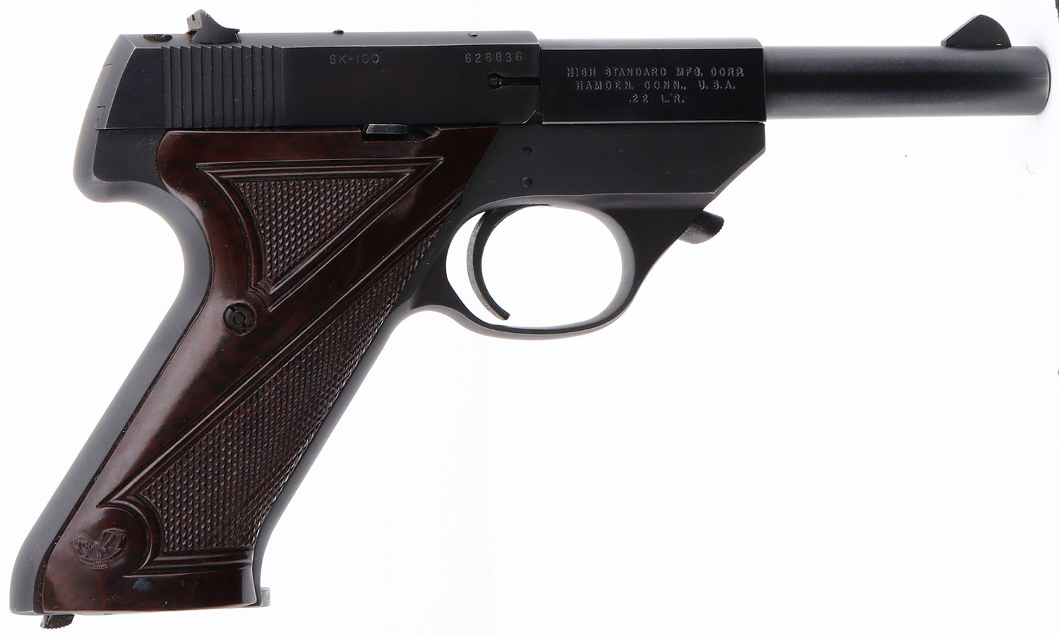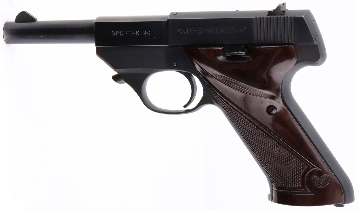 High-Standard, Model ''Sport-King'', SK-100, CAL: 22LR, MFG: 1956, SN: 626836, Semi Auto Pistol, 4 1/2'' barrel. The original, thumb rest & checkered plastic grips are excellent, with minor handling marks. The original metal blue finish on the barrel, barrel housing & slide rates 97% overall, with scuffs on the right side of the barrel housing. Bore is excellent. The slide holds a square notch rear sight & the barrel holds a blade front sight. High Standard detachable mag. FFL or C&R Req. - Value: 250 to 500