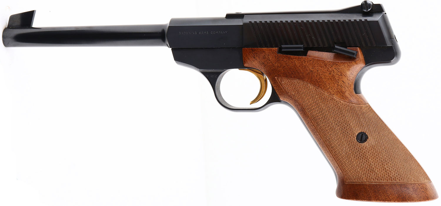 Browning, Model Challenger, Cal. 22 Long Rifle, Semi-Auto, Mfg. 1968, SN: 101365U8, 6 3/4'' barrel, One piece wood checkered grips are excellent, Metal blue finish is 99%, Bore is excellent, gold trigger, Detachable mag. FFL or C&R Req. - Value: 400 to 650