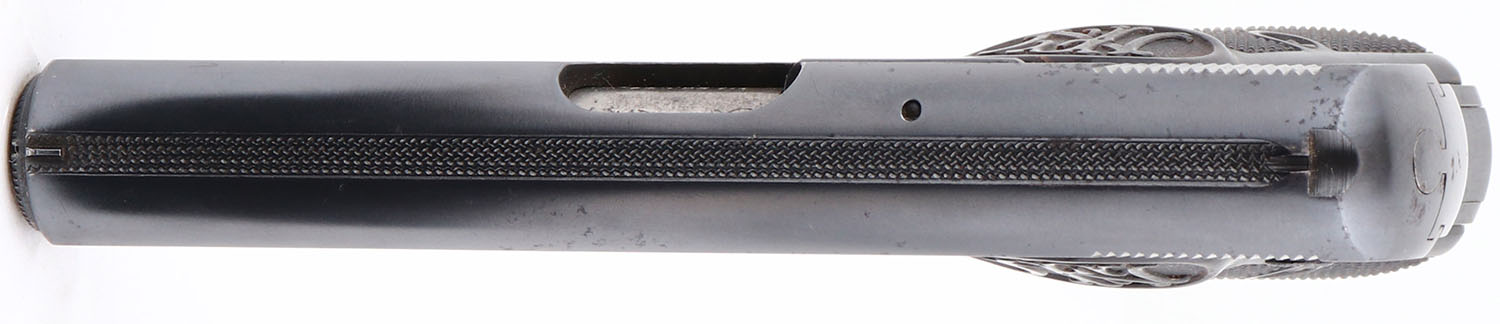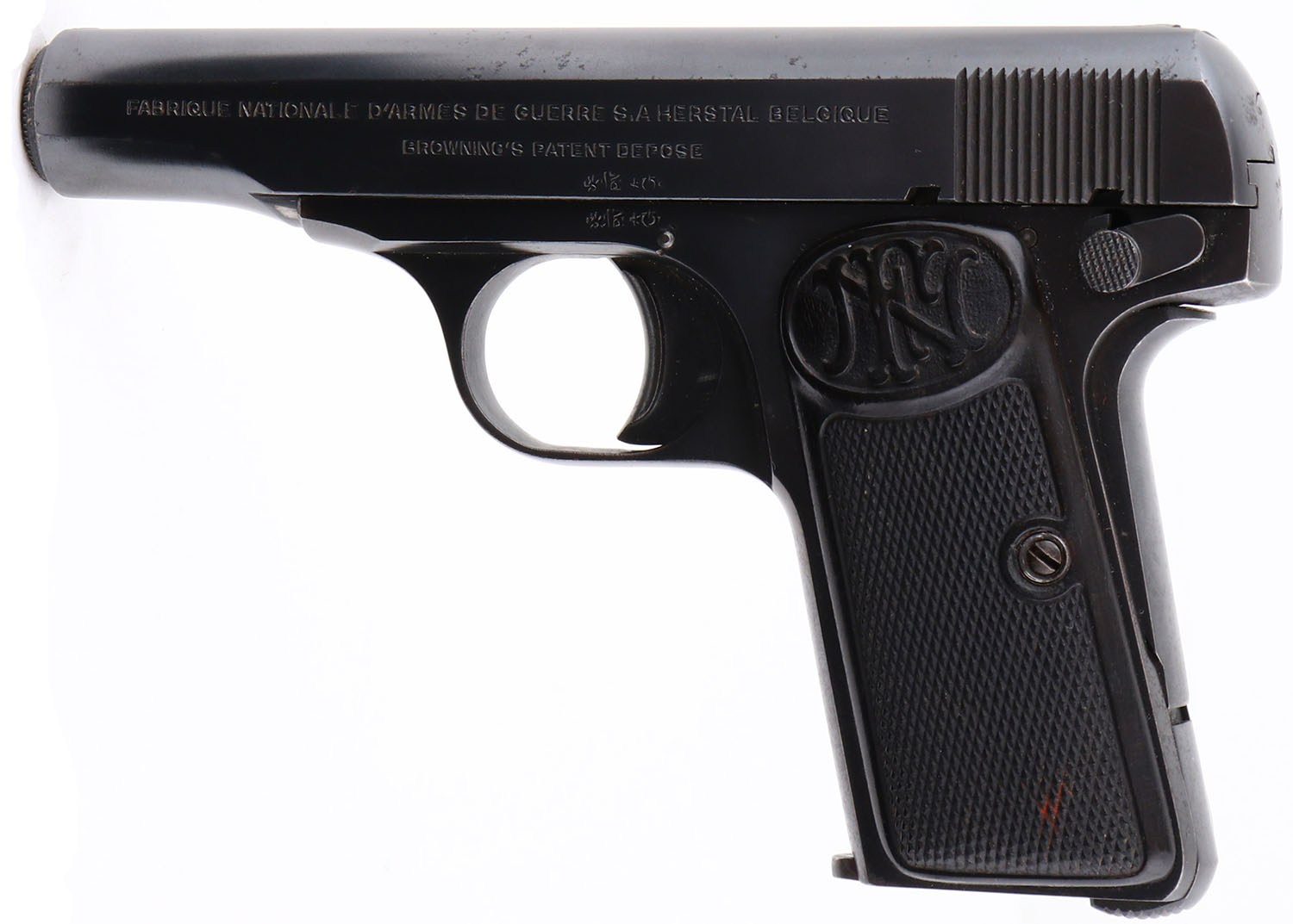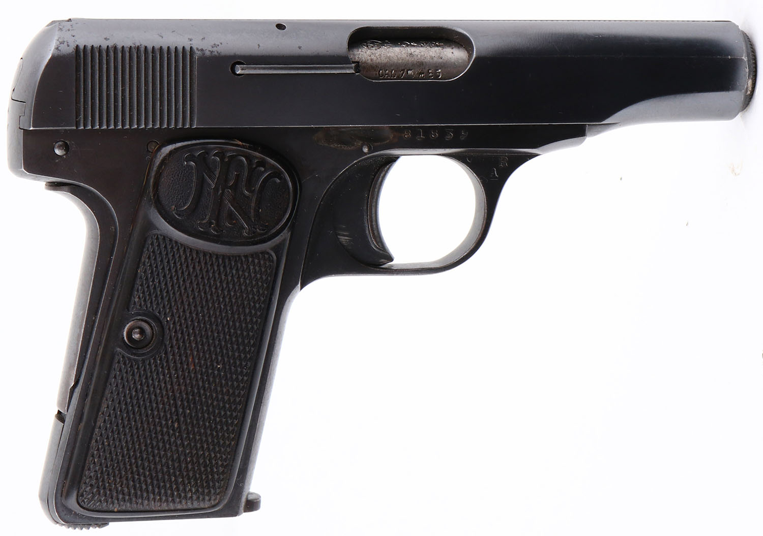FN, M1910, CAL: 7.65 MM (.32 ACP), MFG: 1910's, SN: 81839, Semi-Auto Pistol, 3 3/8'' barrel. Made in Belgium. A blowback semi-automatic pistol designed by John Browning. Approximately 705,000 produced, mainly for the European market, WWI & WWII. The pistol incorporates the standard Browning striker-firing mechanism, a grip safety along with a magazine safety & an external safety lever (known as the ''triple safety'') in a compact package. The original checked grips are excellent with ''FN'' logo on top. The metal blue finish is 95%. There is a ground gouge in the frame above the trigger on the right side, which may have been the original or part of the original SN & possibly restamped. Bore is excellent & bright. Notch & fixed blade sights. Original FN marked 7 round mag. FFL or C&R Req. - Value: 600 to 1000