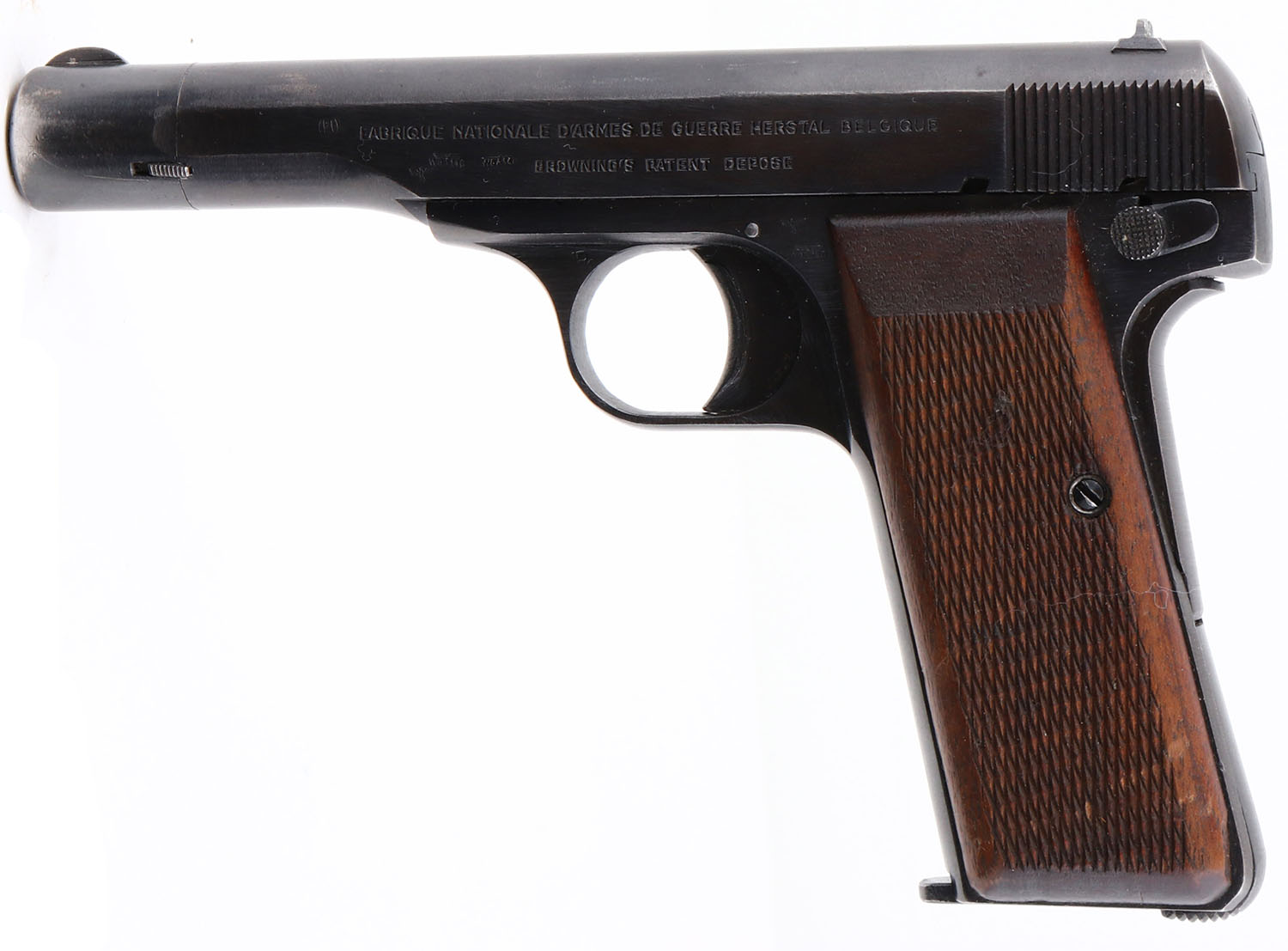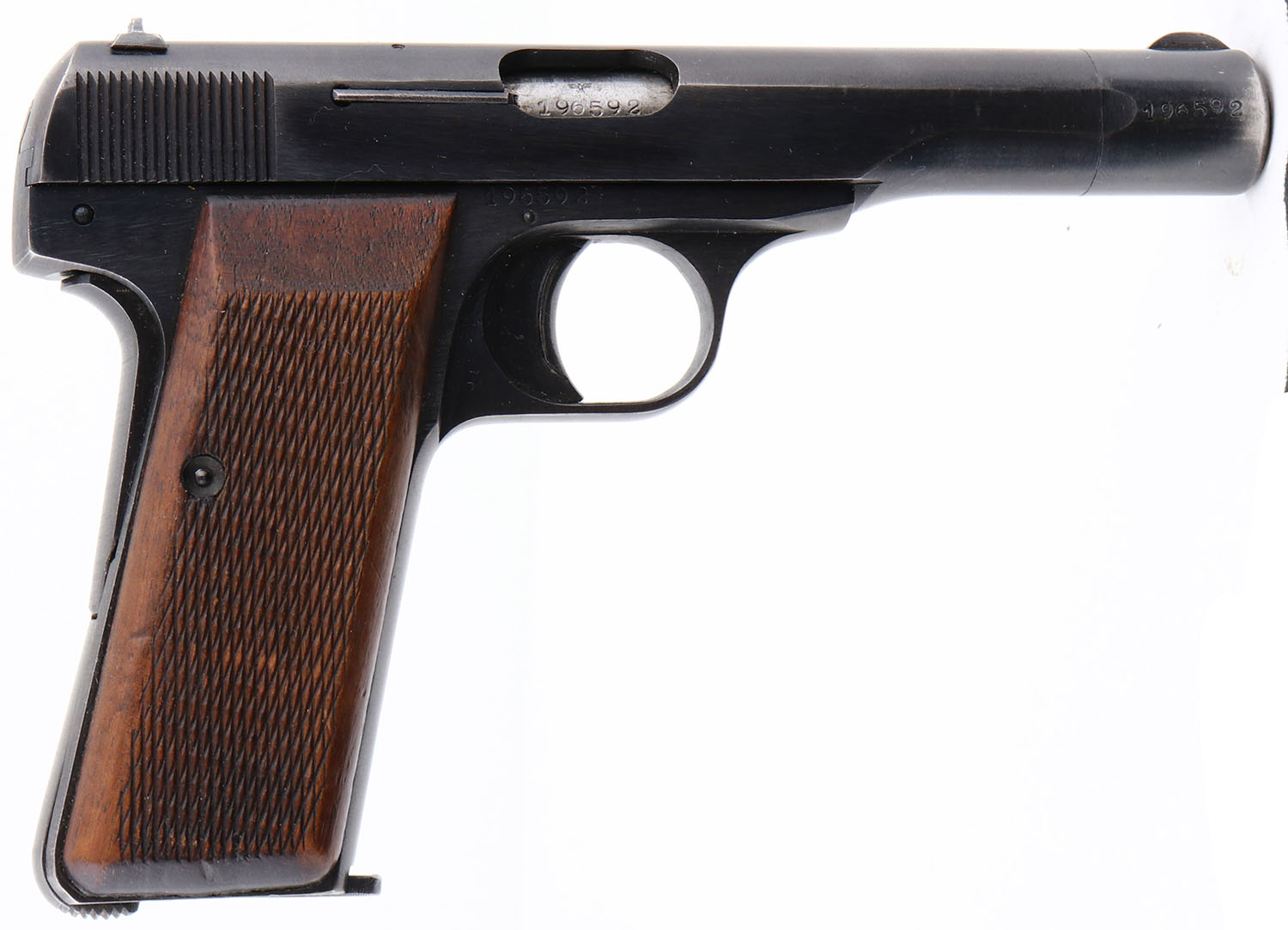 FN, M1922, CAL: 7.65 MM (.32 ACP), MFG: Mid 1943, SN: 196592, Semi-Auto Pistol, 4 1/4'' barrel. Made in Belgium. A blowback semi-automatic pistol designed by John Browning. Approximately 948,000 produced, mainly for the European market & WWII. The pistol incorporates the standard Browning striker-firing mechanism, a grip safety along with a magazine safety & an external safety lever (known as the ''triple safety'') in a compact package. The M1922 has the dubious distinction of being produced in larger numbers than any other firearm at the FN plant during the Nazi occupation. The German designations for the M1922 were Pistole 626(b) for the 7.65mm version & Pistole 641(b) for the 9mm Short version. M1922's found their way to all corners of the German government & military as officer's & official's sidearms. The primary user of the M1922, however was the Luftwaffe. M1922's accepted by the German military show one of three Army Weapons Office inspectors markings (Waffenamt stampings). This pistol has Nazi eagle symbols & ''WaA140'' stampings on the barrel, frame & slide. The original wood checked grips are excellent, with minor scuffs. The metal blue finish is 90%. Bore is excellent & bright. Notch & fixed blade sights. Original FN marked 8 round mag. FFL or C&R Req. - Value: 1000 to 2000