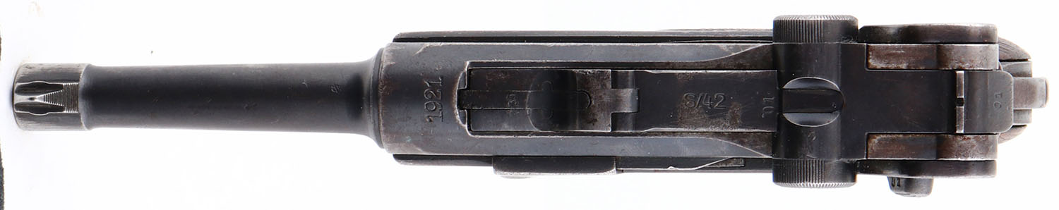 Mauser, Model P08 Lugar, Cal. 9mm, Semi-Auto, Mfg. 1935-39 German, SN: 8801, 3 7/8'' barrel, The original checkered wood grips are very good, with some smoothing of the checkering & a tiny corner chips at the bottom front & upper back of left grip. Metal blue finish is 65%. Stamped with SN ''8801'' on front of frame, ''1921'' on top of barrel, ''4253'' on side of barrel, ''71'' on a couple of smaller parts, ''S/42'' & ''01'' on toggle lock, & ''35'' on extractor. Has stock lug on backstrap. Bore is very good. Has wood magazine floorplate.. FFL or C&R Req. - Value: 800 to 1500