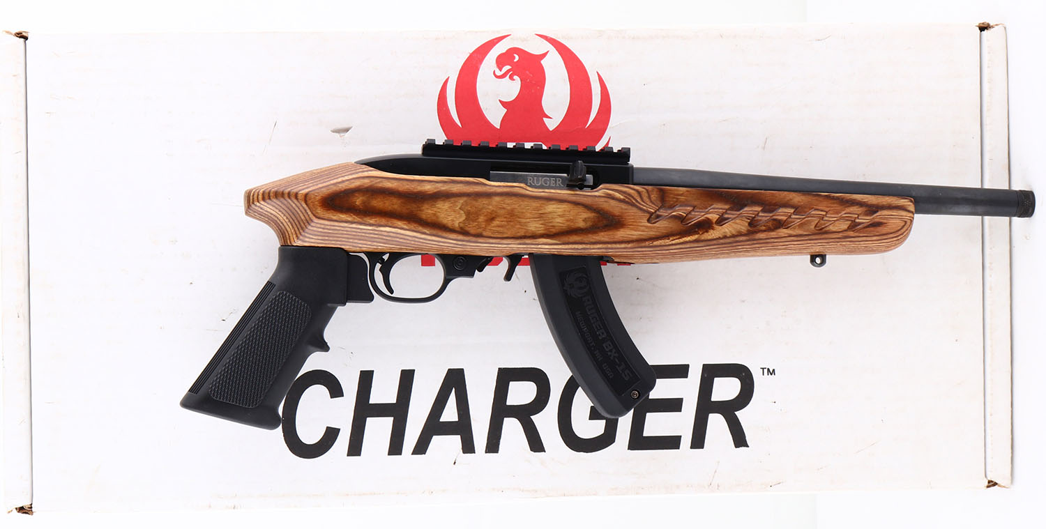 NEW, BOXED, Ruger, Model ''Charger'' Talo Distributor Exclusive, CAL: 22LR, MFG: Modern, SN: 490-60476, Semi Auto Pistol, 10'' barrel. The laminated wood stock & checkered plastic grip are excellent. The metal blue finish on the barrel is excellent, rating 99%+ & the matte black finish on the receiver rates 99%. Bore is excellent, unfired after factory test. No open sight provisions. Receiver holds a factory picatinny rail for optics. Comes in factory box, with Ruger carrying case, lock, UTG bipod, owners manual & test fire cartridge. NOS. FFL Req. - Value: 400 to 600