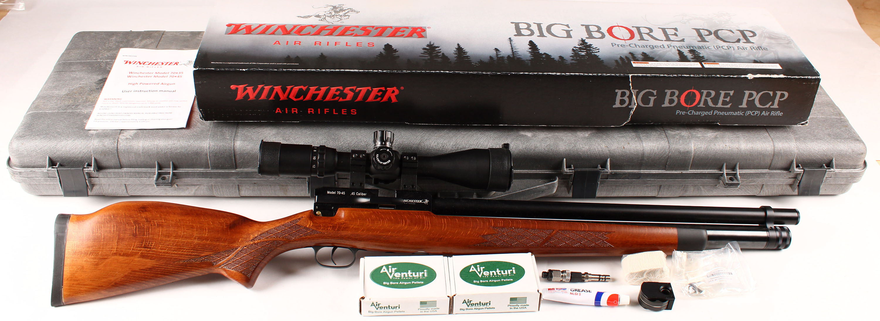 Winchester, Model 70-45 Big Bore Airgun, Caliber 45 Pellet, Single Shot, 23 1/2'' barrel, checkered wood and Aeon 3-12x50 SF Scope. Grade: Excellent + - Value: 300 to 700