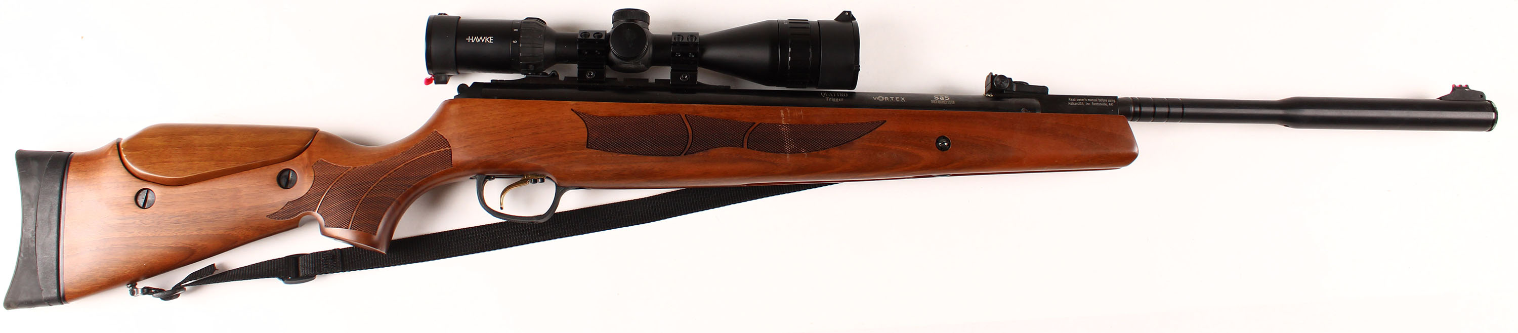 Hatsan, Model Carnivore 135 Big Bore, S/N: 051623818, Caliber 30 Pellet, Single break action, 17 1/4'' barrel, wood checkered stock & Hawke 3-9x32 scope. Grade: Excellent + - Value: 200 to 400