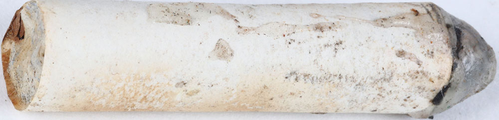 VERY SCARCE N/H, 10.4MM ''Needlefire'' constructed with white paper CS. 1 11/16'' long, closed at the base with paper wad backed with fulminate, LD. PTD. Bullet. Grade: Very Good + - Value: 40 to 120
