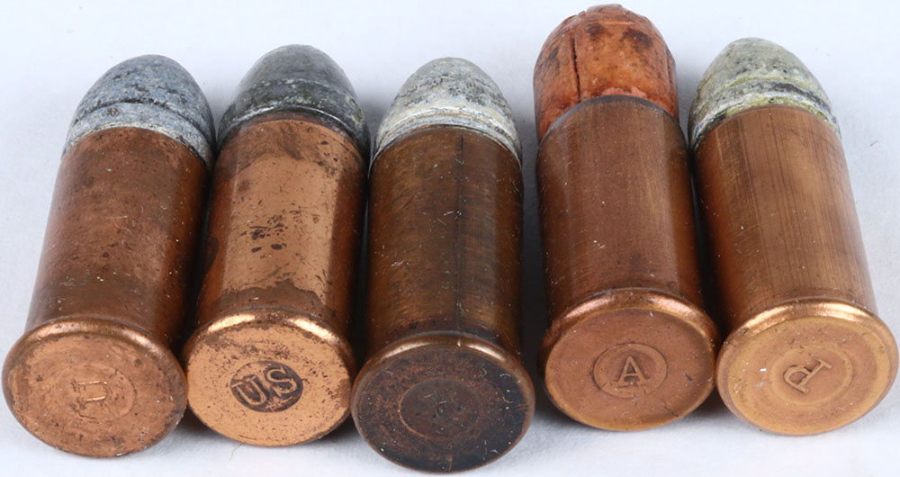 Lot of 5 SCARCE R/F H/S H/S= (raised) ''U'', 38 short R/F COP. CS. R.N.L. 1-GR. H/S= (raised) ''P'', 38 short R/F COP. CS., conical FLT. TIP LD. Belted H/S= (raised) ''A'', 38 short, shot load, tan paper sabot H/S= (raised) ''H'', 38 short R/F COP CS., R.N.L. 1-GR. H/S= (raised) ''U.S.'' 38 short R/F COP. CS. R.N.L. belted. Grade: Excellent - Value: 20 to 70