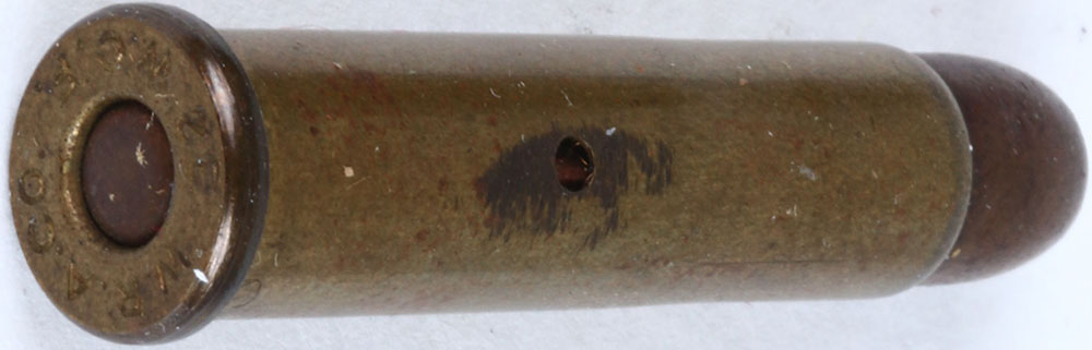 RARE H/S= ''W.R.A.CO. 32 W.C.F.'' Winchester lawsuit function dummy cartridge for the Krutzsch gun in 1894-1897 trial. SM. Oval COP. PRI., 2-SM. CS. Holes internal wood rod, F.P. G.M. F.N. Shuey vol. 1 page 215. Grade: Excellent - Value: 200 to 400