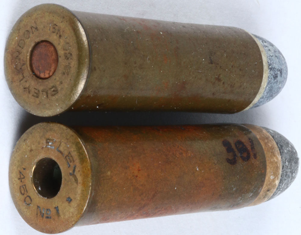 Lot of 2 Variations (1) H/S= ''ELEY 450 No 1'' 1 1/2'' CL. Small oval copper primer, PP. RNL. Copper tube (1) H/S= ''ELEY LONDON 450 No 1'' 1 1/2'' CL., small oval copper primer, PP. RNL. HP. Grade: Very Good + - Value: 20 to 70
