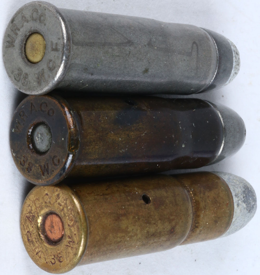 Lot of 3 ''W.R.A.CO.'' SCARCE variations H/S= ''W.R.A.CO. 38 W.C.F.'' TIN. CS. - proof -, SM. Oval BR. PRI., S.P. TIN F.N. H/S= ''W.R.A.CO. 38 W.C.F.'' Brown CS. 2-holes, internal wood rod, F.P. TIN F.N. B'T. SM. Oval TIN. PRI. ''W'', ''Function Dummy''. H/S= ''W.R.A.CO. 38 W.C.F.'' 2-CS. Holes internal wood rod, salesman's dummy, 1-CNN,. Grade: Excellent - Value: 40 to 70