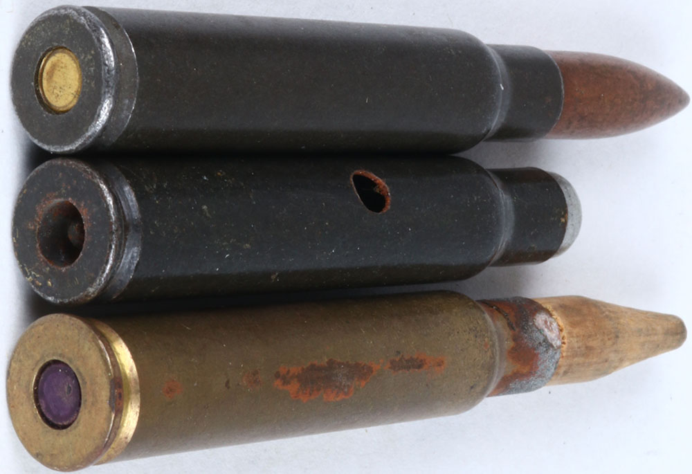 Lot of 3 SCARCE Variations (1) N/H 7.7 x 58 JAP. Black steel case, flat brass primer, FP. GM. PTD. (1) N/H 7.7 x 58 JAP. Clack case 1-hole dummy, no primer, RND. TIN CAP. (1) N/H 7.7 x 58 JAP., wood bullet blank, oval copper primer, PTD. Wood All Rimless Grade: Very Good ++ - Value: 20 to 50