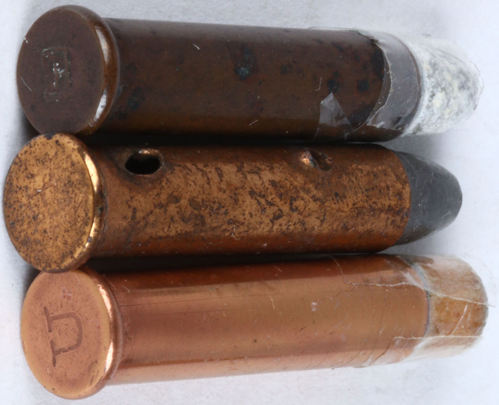 Lot of 3 SCARCE R/F Variations (1) H/S= (RAISED) ''E'' 25 Stevens long COP. CS. FNL. (1) H/S= (IMP.) ''U'' 25 Stevens long COP. CS. Shot load, wood sabot (1) H/S= (IMP.) ''H'' 25 Stevens long B.D., 2-mounting holes, internal wood rod COP. CS. FNL. Grade: Very Good + - Value: 20 to 50