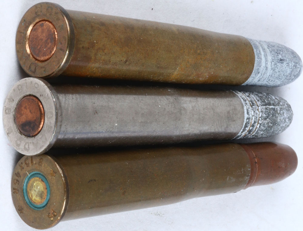 Lot of 3 Variations (1) H/S= ''DWM 8.15 x 46 R'' large flat copper primer, RNL. 2-KN (1) H/S= ''GECADO 8.15 x 46'' (flanged) large flat copper primer, RNL. 2-KN (1) H/S= ''PS 8.15 x 46 R'' flat brass primer, SP. GM. FN. Belted Grade: Very Good + - Value: 10 to 40