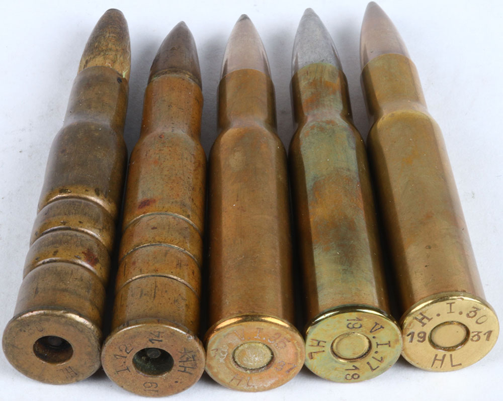 Lot of 5 (1) H/S= ''I-12 1914 HL'' 8 x 58R Danish Krag dummy NO PR. 3-GR. CNN FP. GM. PTD. (1) H/S= ''HL 98'' 8 x 58R Danish Krag NO PRI. 3-deep CS. CNN. Dummy wood PTD. B'T. (1) H/S= H.I. 30 1931 HL'' 8 x 58R Danish Krag FLT. BR. PRI., FP. Tin FN. -X (1) H/S= ''VI35 1937 HL'' 8 x 58R Danish Krag FLT. BR. PRI. FP. Tin PTD. -X Grade: Excellent - Value: 20 to 50