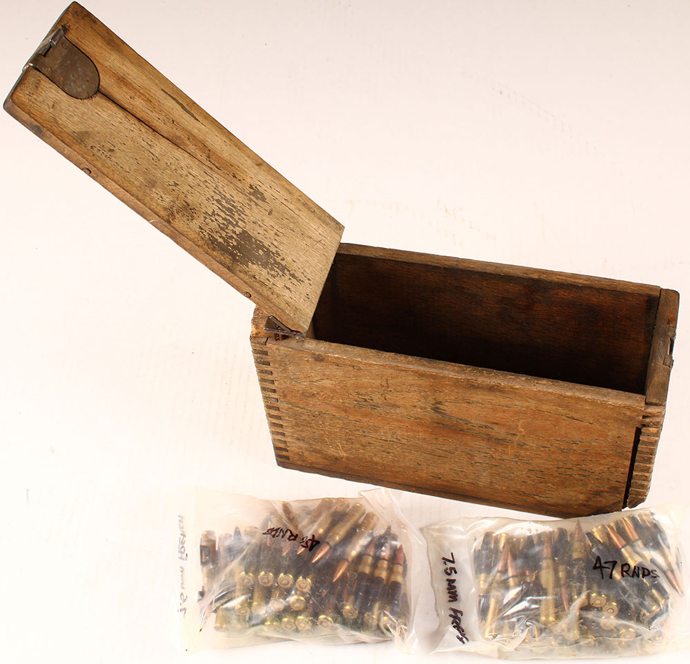 Military ammo crate, with 2 sealed bags of linked 7.5mm French, one has 47 Rds. The other has 48 Rds., ammo is excellent. Grade: Very Good + - Value: 40 to 120