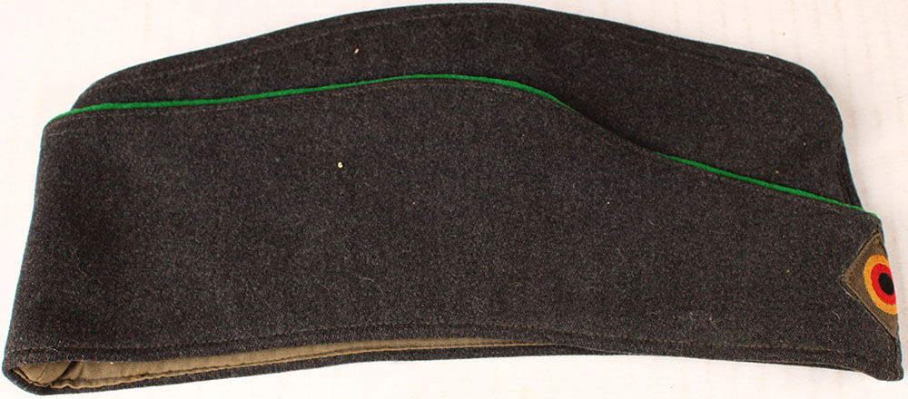 West German, Bundeswehr Side cap Shiffchen, Size 57, has light wear, inside label reads, ''G.U.F. BRAND'', ''USI 2D/15411/005/3'', ''57'', ''8405-12-137-6811'', & has purple ''A'' stamp over label. Grade: Excellent - Value: 4 to 20