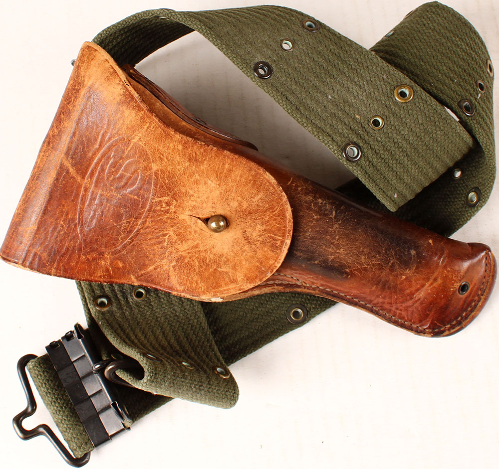 US, Military belt & leather holster, belt has faint markings, holster marked, ''US'', ''WALSH'', ''44'', holster has wear from age & use, belt shows wear. Grade: Very Good + - Value: 10 to 40