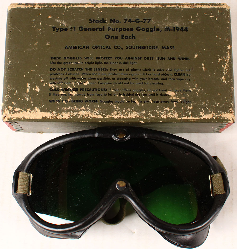 US, WW2 Type 1 General Purpose Goggle, M-1944, made by American Optical Co, box has scratches & edge wear but is solid, goggles show no wear, green lens inside goggles & clear lens in inside sealed packet inside the box. Grade: Excellent - Value: 20 to 60
