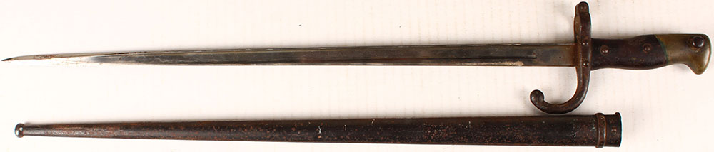 French, M1874 Gras bayonet, Spine of blade is marked in French & translates to, ''MANUFACTURED AT THE ARMORY AT ST. ETIENNE February 1877'', right side of blade marked with two faint stampings, left side of guard is marked with two faint stampings, & ''FG 3012'', sheath is marked, ''H 67926'', blade has no rust & shows no sign of pitting. Grade: Very Good + - Value: 80 to 160