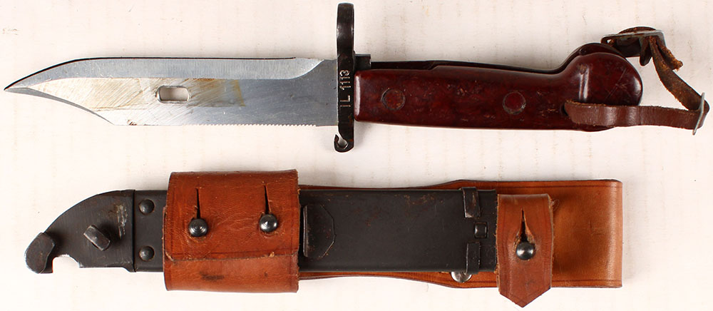 Romanian, AKM Bayonet, right side of guard is marked, ''IL 1113'', sheath marked, ''IL 1113'', has light wear, comes with sheath & frog. Grade: Excellent - Value: 30 to 120