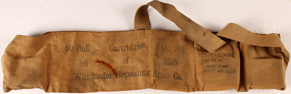 Winchester, Empty 30-40 krag bandoleer, marked, ''60 BALL CARTRIDGES CAL. 30,'', ''MODEL OF 1898'', ''WINCHESTER REPEATING ARMS CO.'', ''RIFLE VELOCITY'', ''AT 58 FT.'', ''1958 FEET'', ''JULY ?? 190?'', has two carboard inserts inside two of the pouches. Grade: Very Good + - Value: 10 to 30