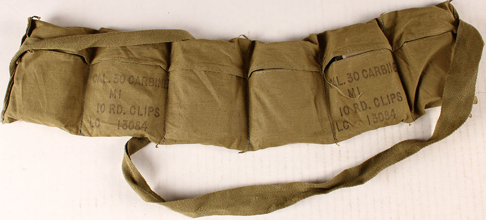 US, lake city, 6 pouch bandoleer with 2 clips of 10 Rds. Of .30 carbine in each pouch, ammo is excellent, bandoleer is marked, ''CAL. 30 CARBINE'', ''M1'', ''10 RD. CLIPS'', ''LC 13084''. Grade: Very Good ++ - Value: 60 to 120