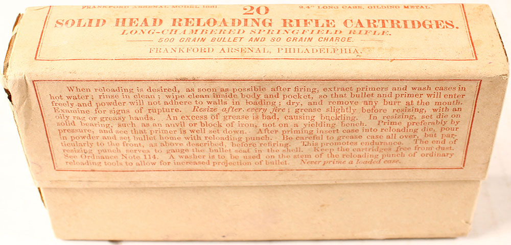 Frankford Arsenal, Solid head reloading rifle cartridges, long-chambered Springfield rifle (45-70), 500 Grain Bullet, 80 Grain Charge, back of box is stamped, ''INITIAL VELOCITY.'', ''1329 FEET.'', ''APR 29 1881'', 2pc, Full, buff box & label with red print, box is solid with light age soiling & light rub wear, ammo is very good. Grade: Excellent + - Value: 20 to 100