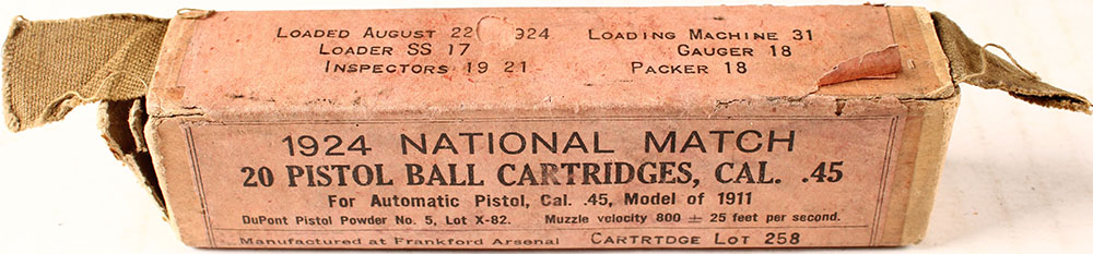 Frankford Arsenal, .45 Pistol Ball Cartridges, 1924 National Match, 1pc, Full, buff box with red label & black print, box has left end opened, partial seal tears on right end, rub marks, light edge wear & light age soiling, ammo is excellent. Grade: Excellent - Value: 10 to 30