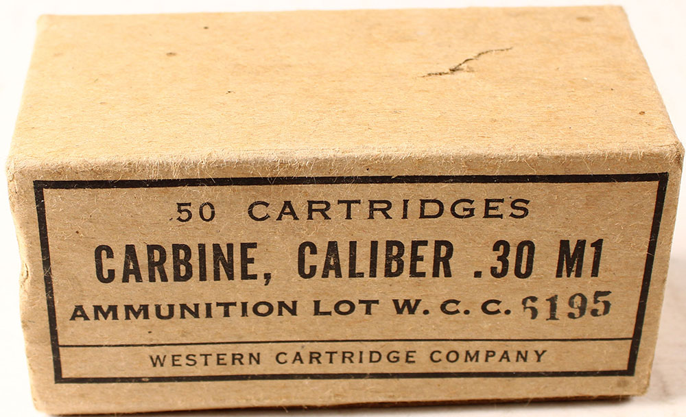 Western, .30 M1 Carbine, 1pc, Full, buff box with black print, box is solid with light rub wear, ammo is very good. Grade: Excellent + - Value: 30 to 60