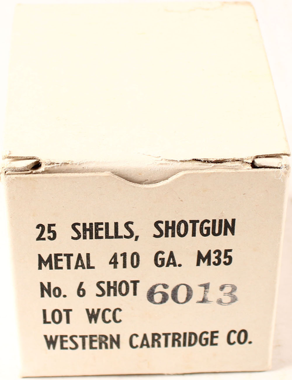 Western, .410 GA. M35, Metal shell, No. 6 Shot, Lot WCC 6013, 1pc, Full, buff box with black print, box is solid with light age soiling, light rub marks & light edge wear, ammo is very good. Grade: Excellent - Value: 20 to 40