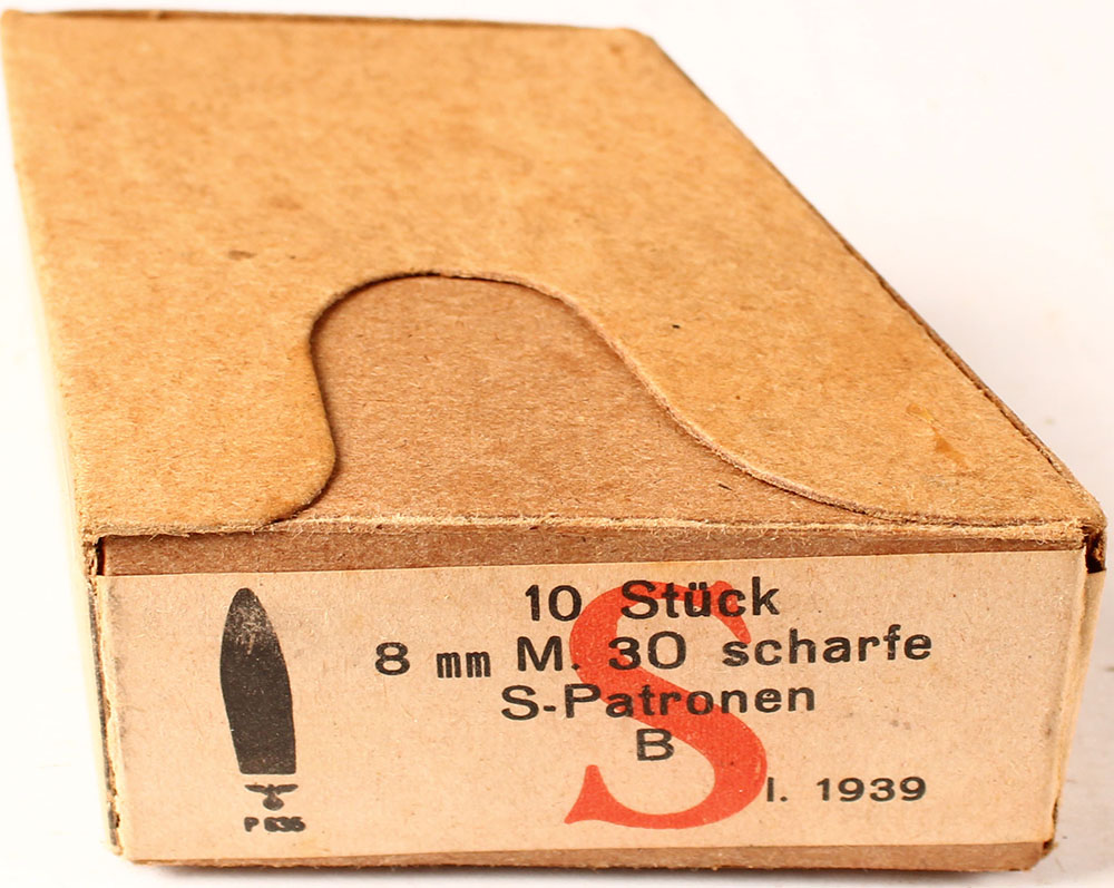 German, 8mm M.30 scharfe, S-Patronen (8x56mmR), 1939 dated, 2pc, Full, buff box & label with black/red print, box is solid with a partial tear in one seam of top cover, ammo is excellent. Grade: Excellent + - Value: 10 to 30