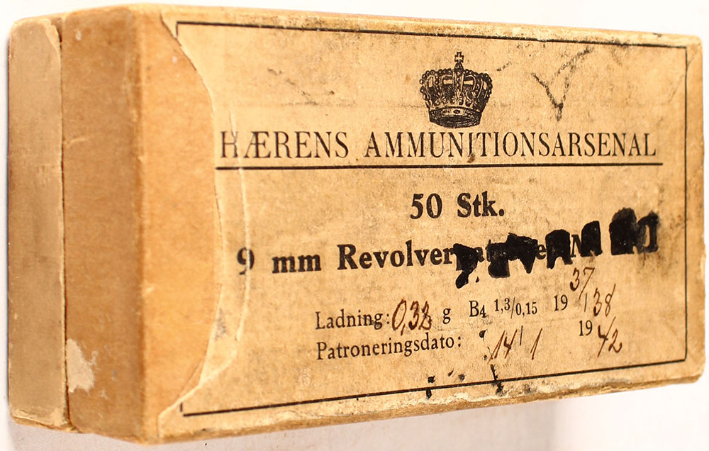 Haerens Ammunitions arsenal, 9mm Revolver, 1941 dated, 2pc, Full, buff box & label with black print, box is solid tear in front label, light age soiling, rub marks & light edge wear, ammo is excellent still covered in grease from factory. (788) Grade: Very Good ++ - Value: 20 to 60
