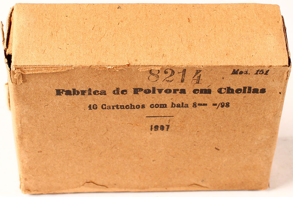 Fabrica de Polvora em Chellas, 8mm Portuguese, 1pc, Full, brown box with black print, box is solid with one flap torn, & light rub marks, ammo is very good with cracks on necks of most cases. (1242) Grade: Excellent - Value: 10 to 30