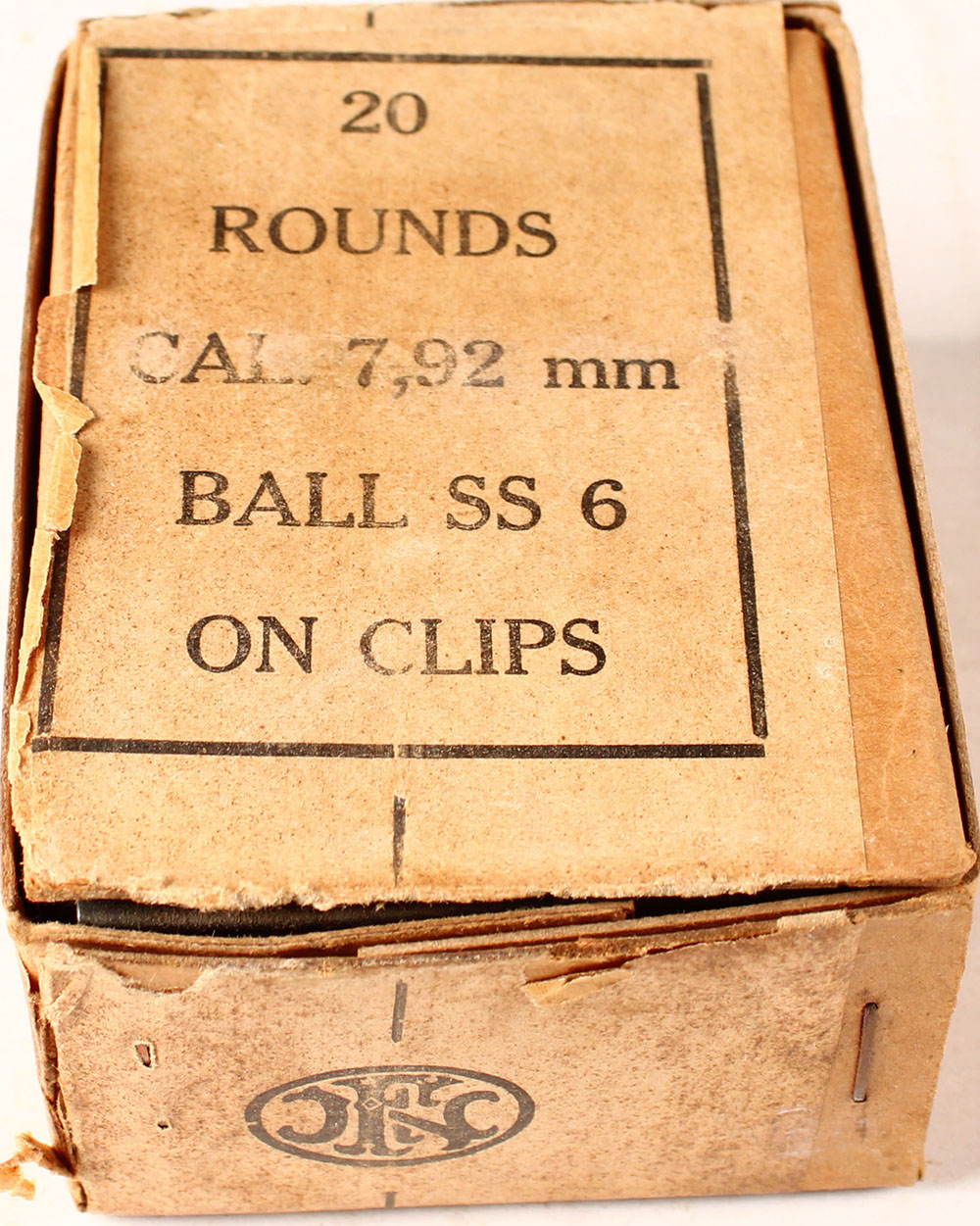 FN, 7.92mm Ball SS 6, on clips, 2pc, Full, buff box & label with black print, box is solid with light rub wear & light age soiling, ammo is very good. Grade: Excellent - Value: 10 to 40