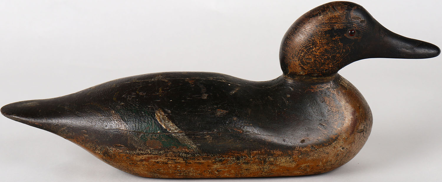 Pintail Hen by Mason Decoy Company, Detroit, MI,1896-1924 standard grade, glass eyes, solid wood, has age cracks in back, original paint. Grade: Very Good + - Value: 150 to 300