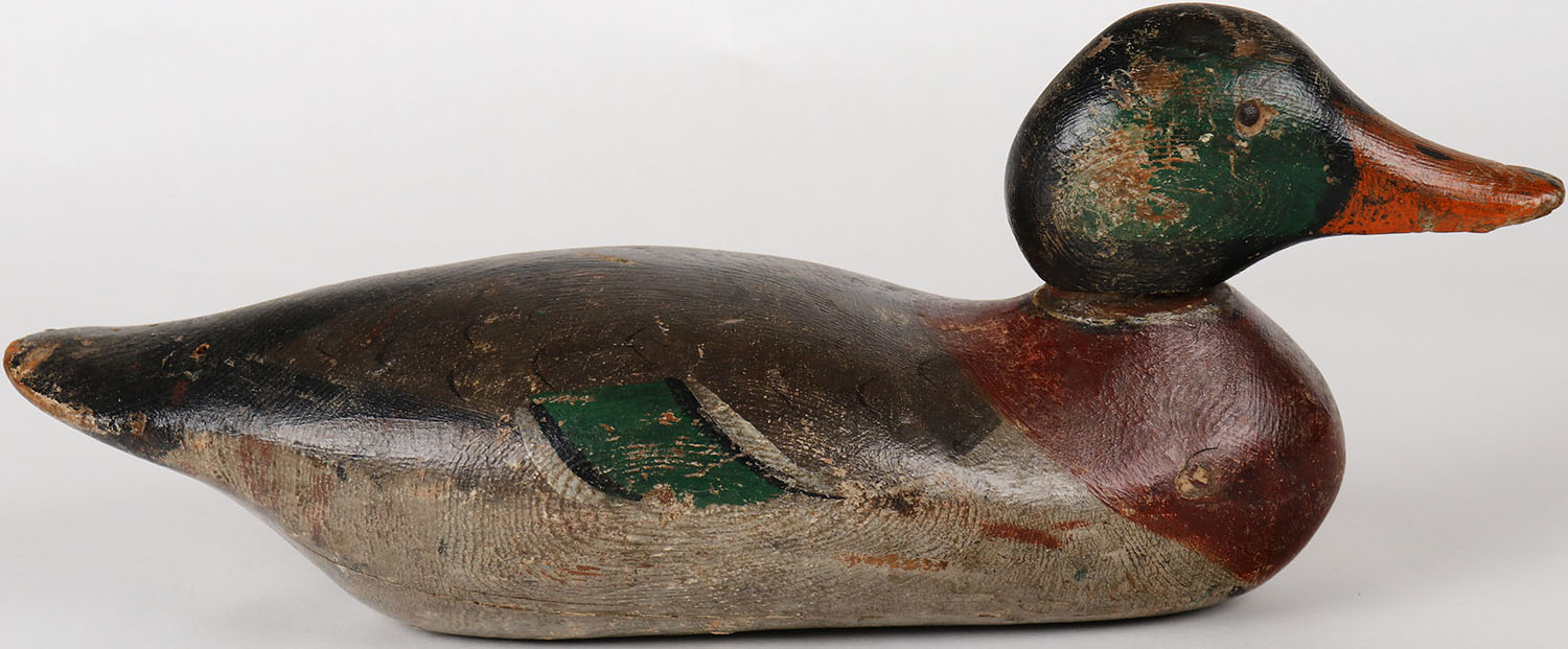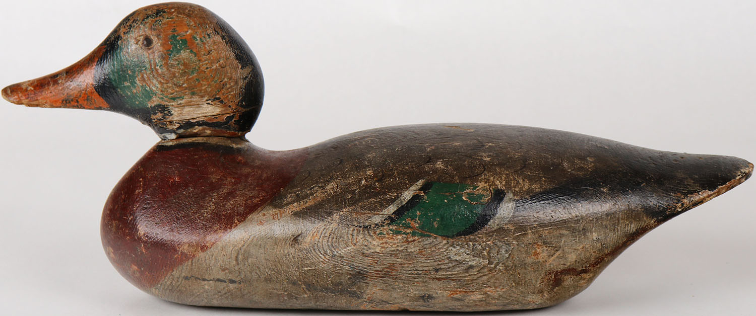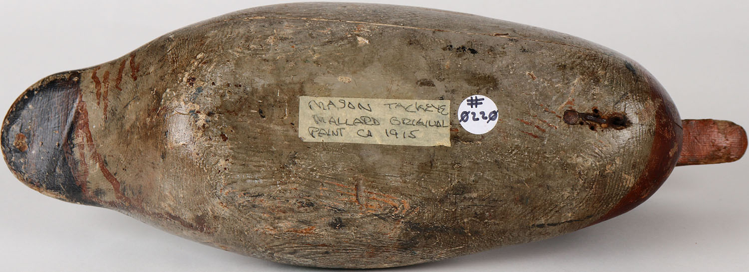 Mallard Drake by Mason Decoy Company, Detroit, MI, 1896-1924 standard grade, tack eyes, solid wood, missing neck filler, has age cracks, original paint. Grade: Very Good + - Value: 100 to 250