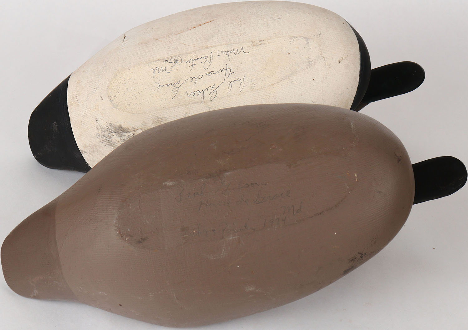 Pair of Canvasbacks by Paul Gibson, Havre de Grace, MD, painted eyes, solid wood, structurally excellent, signed on bottom, original paint. Grade: Excellent ++ - Value: 80 to 300