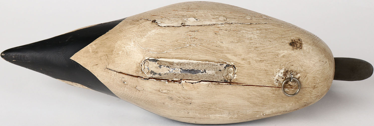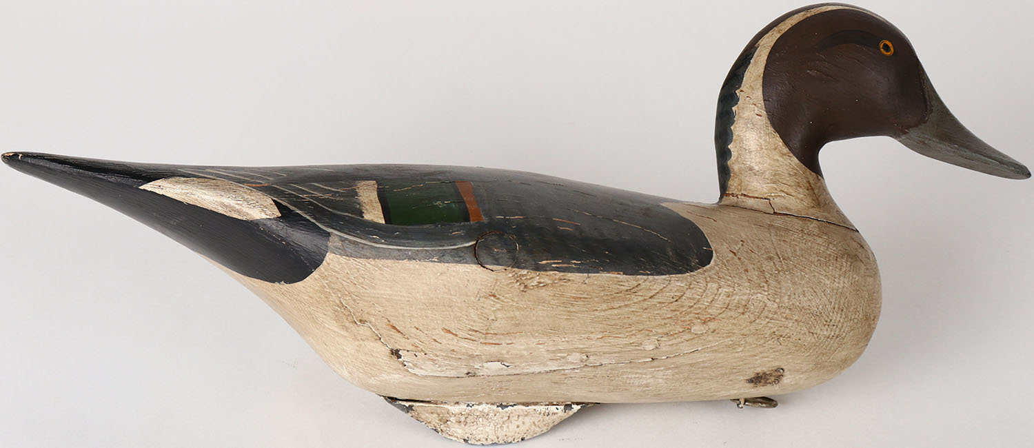 Pintail Drake by unknown maker, Havre de Grace, MD, painted eyes, solid wood, has age cracks on bottom and around neck, original paint. Grade: Very Good ++ - Value: 100 to 200