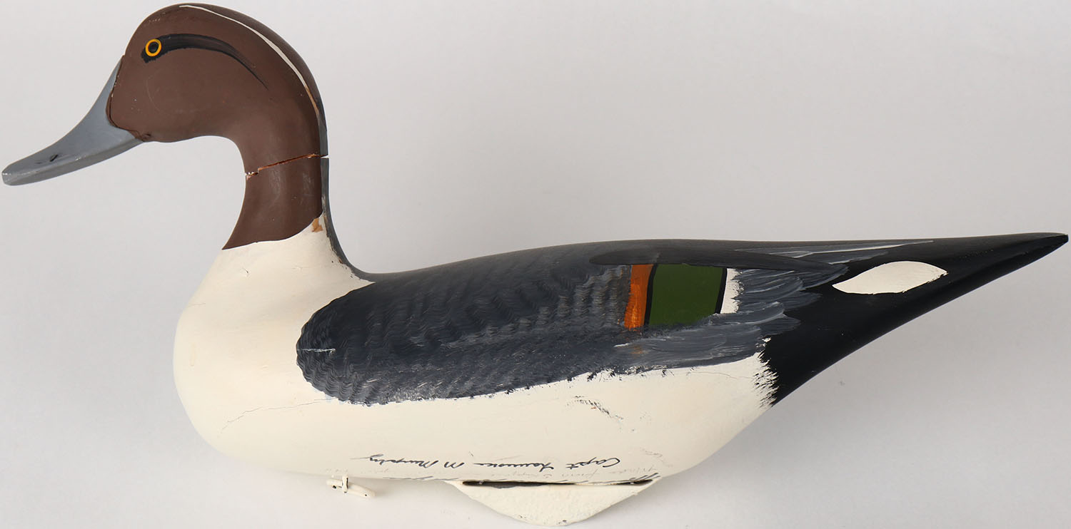 Pintail Drake by Capt. Harry Jobes Havre de Grace, MD, painted eyes, solid wood, has age crack around neck, original paint. Grade: Very Good ++ - Value: 70 to 200