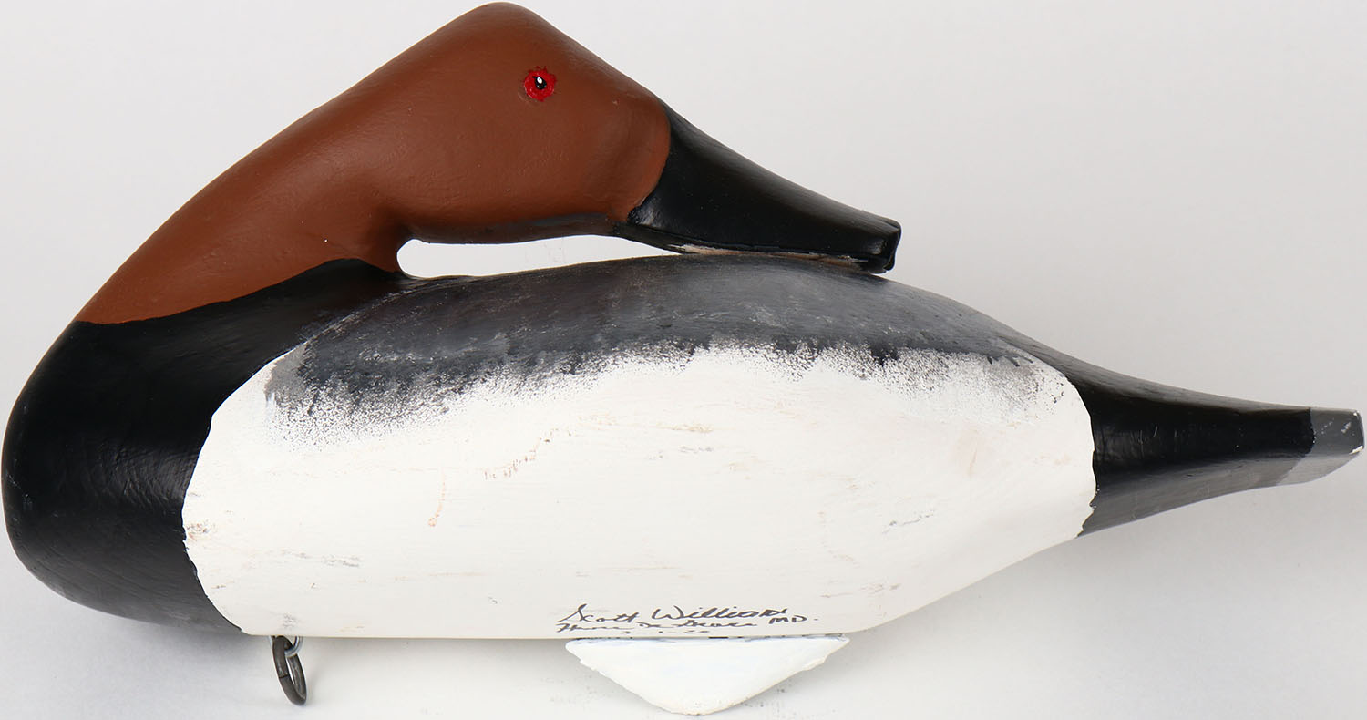 Preening Canvasback Drake by Scott William Havre De Grace MD. painted eyes, solid wood, structurally excellent, signed on bottom, repainted. Grade: MINT - Value: 50 to 100