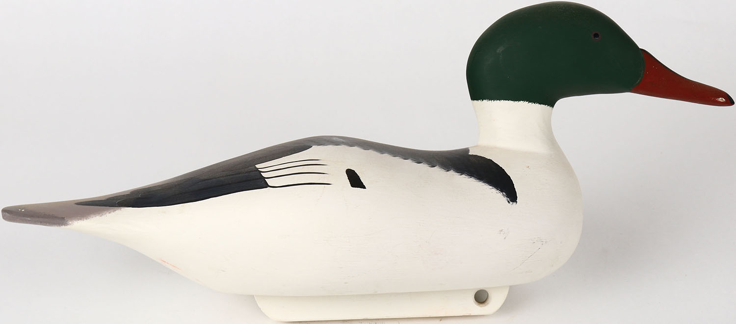 Common Merganser Drake by Bryon Bodt, Churchille MD, glass eyes, solid wood, structurally excellent, branded BODT on bottom and signed, original paint. Grade: Excellent ++ - Value: 50 to 100