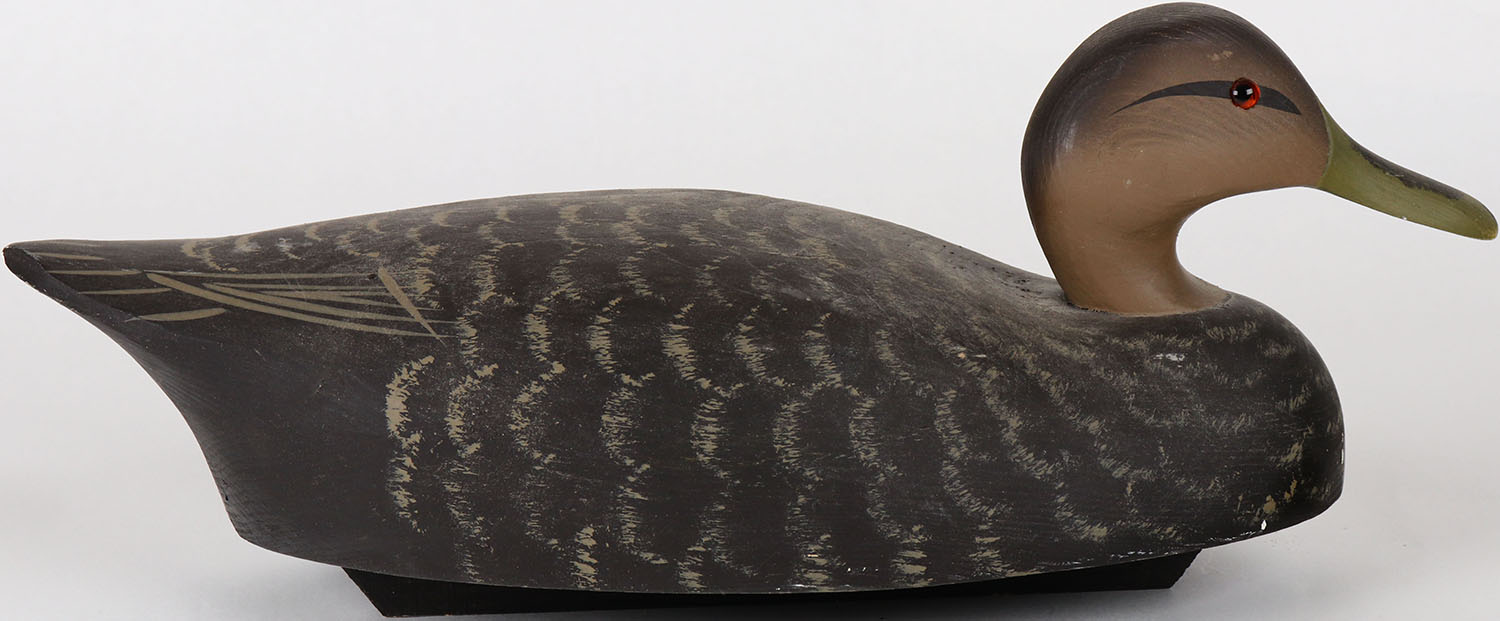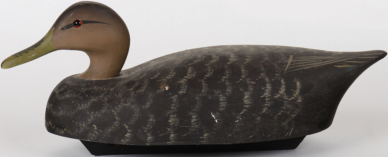 Black Duck by Barnegat Bay Decoys, Barnegat Bay, NJ, glass eyes, solid wood, structurally excellent, branded on bottom, original paint. Grade: Excellent ++ - Value: 70 to 150