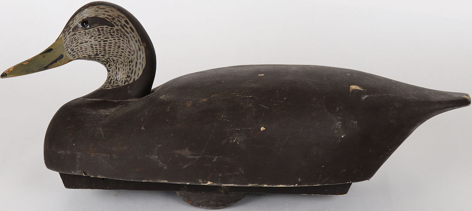 Black Duck by Wildfowler Decoys, glass eyes, solid wood, structurally excellent, branded on bottom, original paint. Grade: Excellent + - Value: 50 to 100