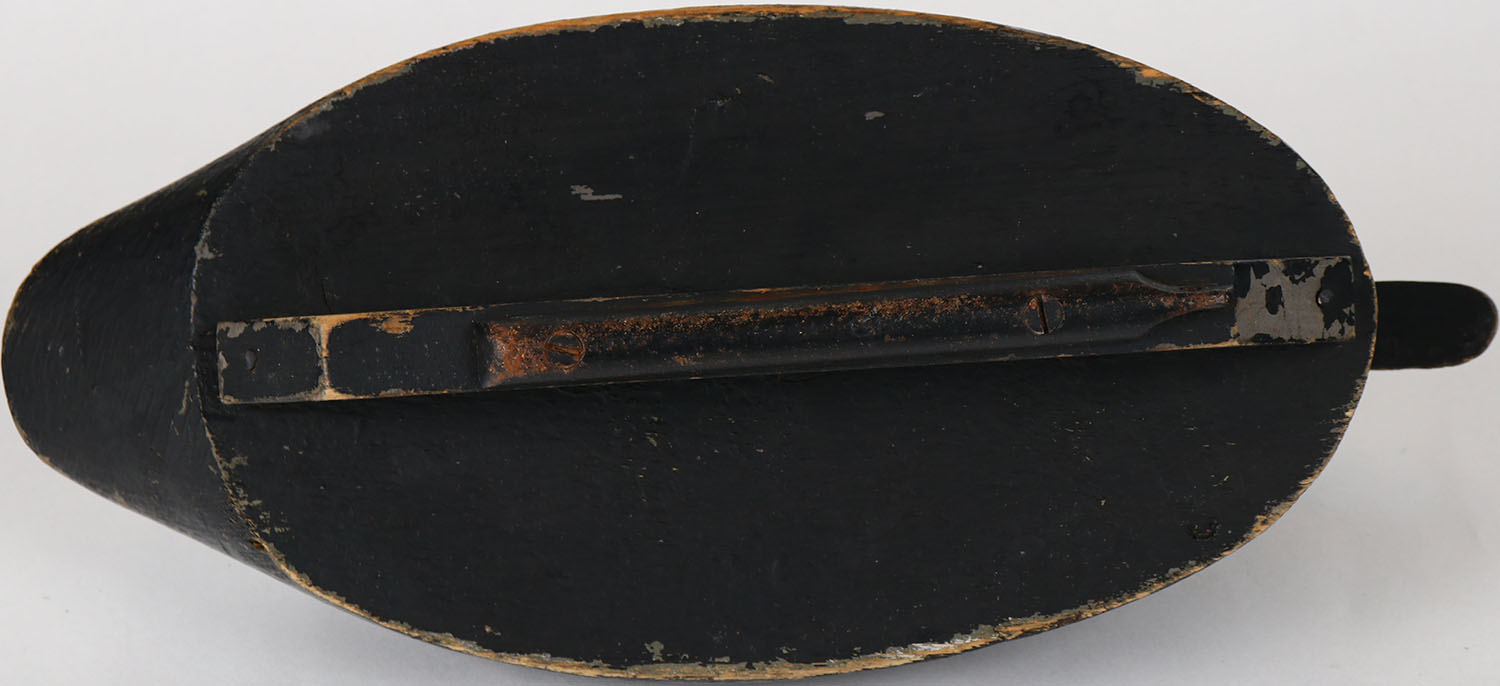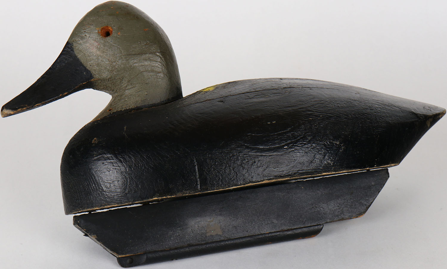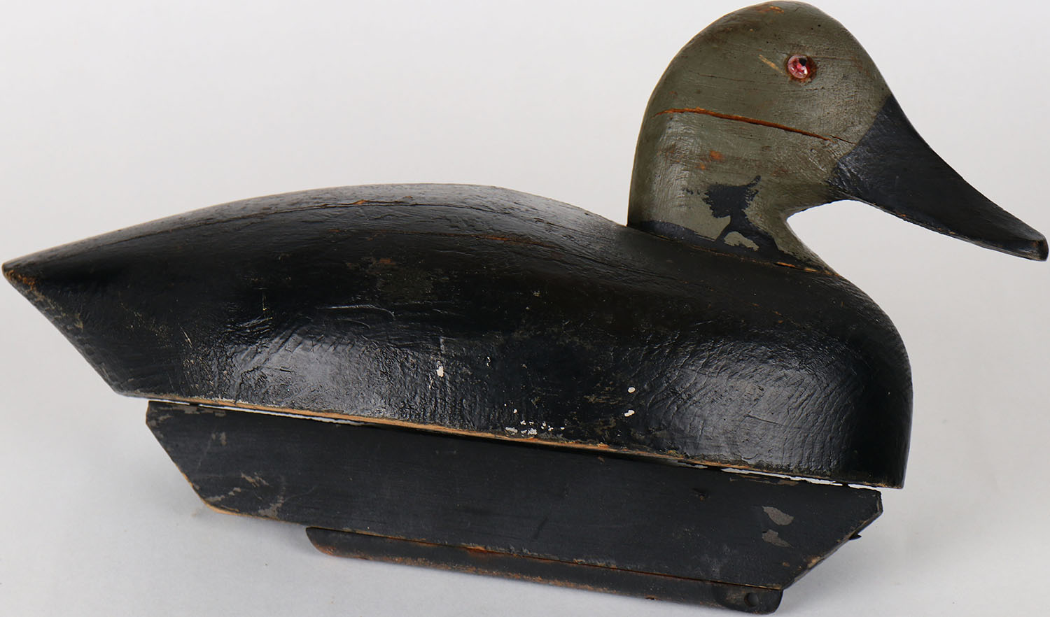 Black Duck by unknown maker, glass eyes, one eye is missing, the other is cracked, solid wood, has age cracks on back and head, original paint. Grade: Very Good ++ - Value: 30 to 60