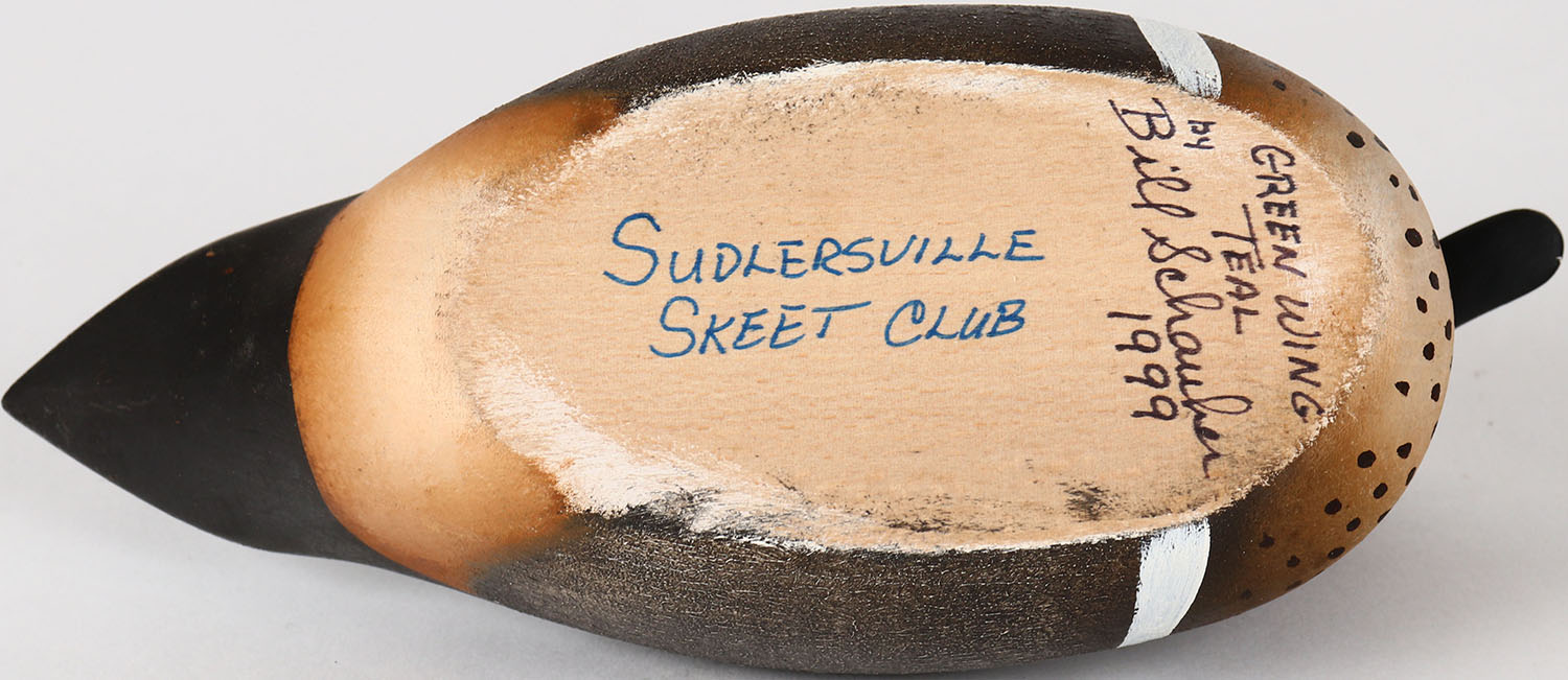 Green Wing Teal Drake by Bill Schauher, (1999) tack eyes, solid wood, used at Sudlersville Skeet Club, structurally excellent, original paint. Grade: Very Good ++ - Value: 50 to 100
